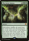Each player shuffles all cards from their hand and all permanents they own into their library, then draws that many cards. Each player may put any number of land cards from their hand onto the battlefield. Exile The Great Aurora.