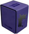 The Alcove Flip Box for Pokémon features a debossed image of Gengar on a leatherette finish with premium foil detailing. A strong magnetic closure keeps your cards safely secured inside, and dual thumb notches offer easy access to your deck. This Deck Box® holds up to 100+ standard size trading cards double-sleeved in Ultra PRO Deck Protector® sleeves. The lid can be detached from either side of the box to accommodate any play style.