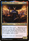 Dark One's Own Luck — Whenever you roll one or more dice, Farideh, Devil's Chosen gains flying and menace until end of turn. If any of those results was 10 or higher, draw a card.